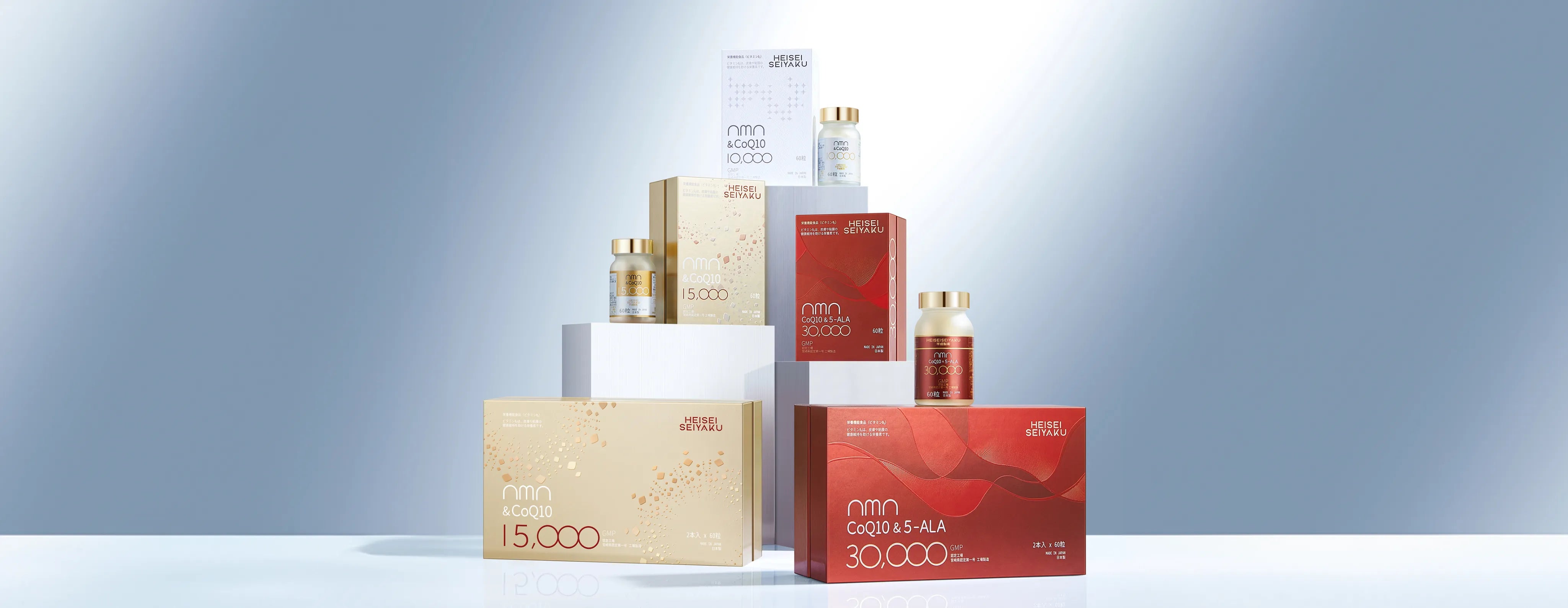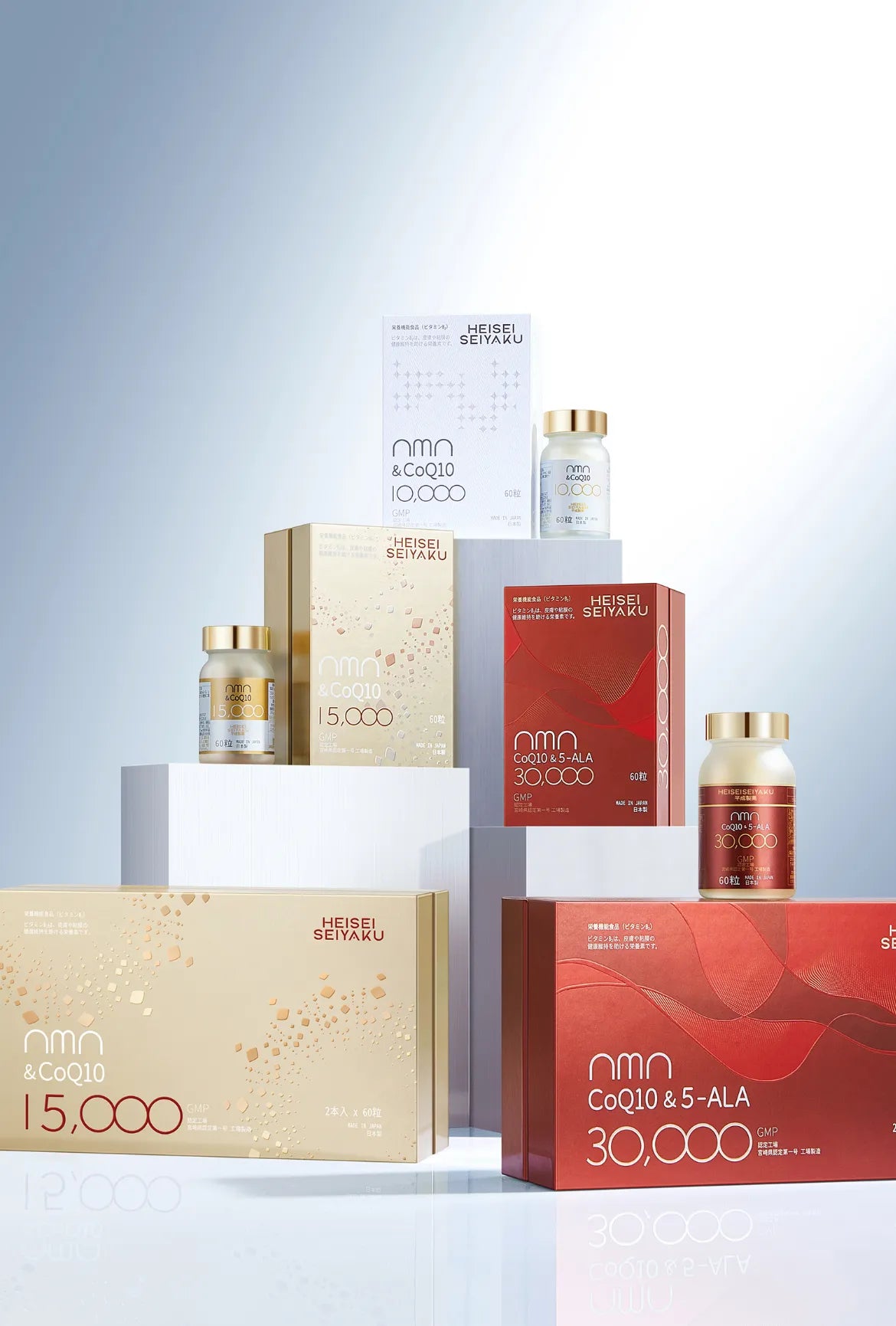平成製薬の製品は、国内産のNMN(ニコチンアミドモノヌクレオチド)をはじめ、厳選された極上品質の成分を使用しています。NMNは、加齢とともに失われがちなビタミンに似た成分で、若々しく健康な毎日をサポートします。当社の製品では、NMNの最高級原料をたっぷりと贅沢に配合し、健康と美を求める方々にとって最高のパートナーとなることを願い、品質と安全性にこだわり抜いています。